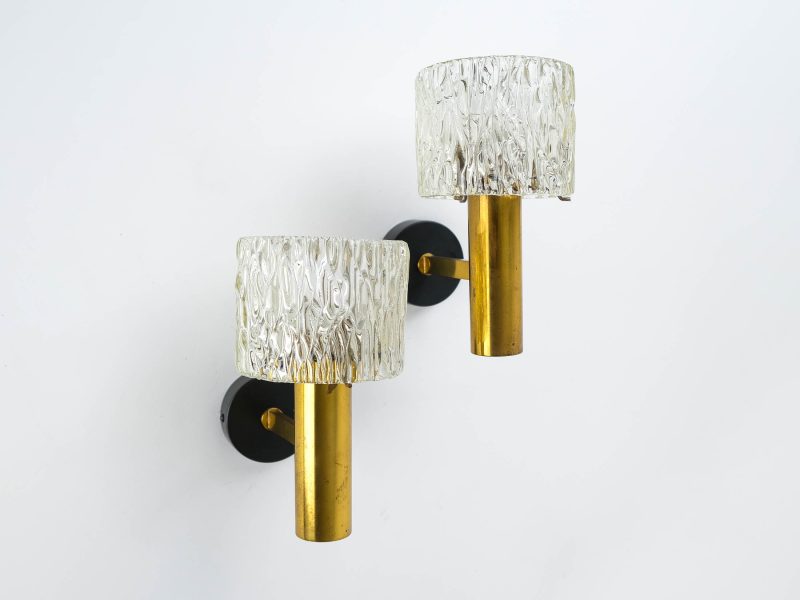 For sale an elegant pair of glass & brass wall lights, attributed to Carl Fagerlund for Orrefors Glasbruk of Sweden, circa 1960s. The lights are in perfect working order and…